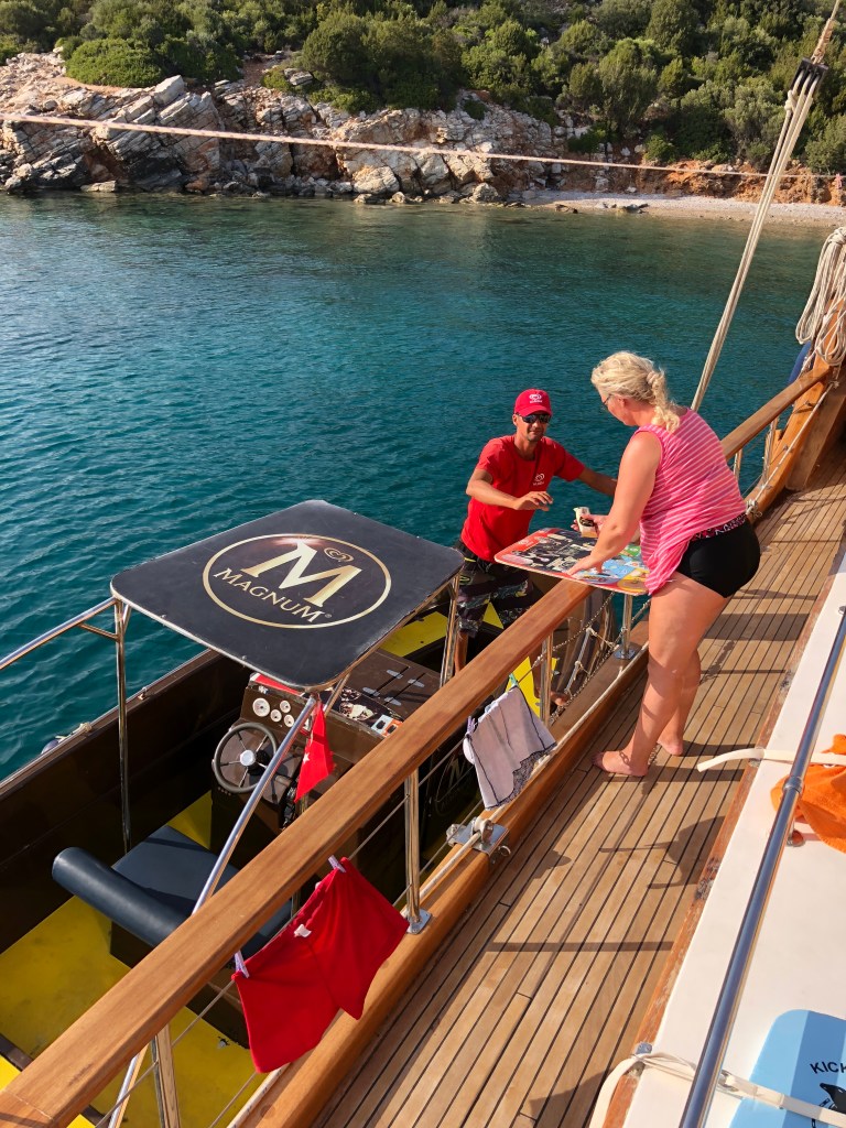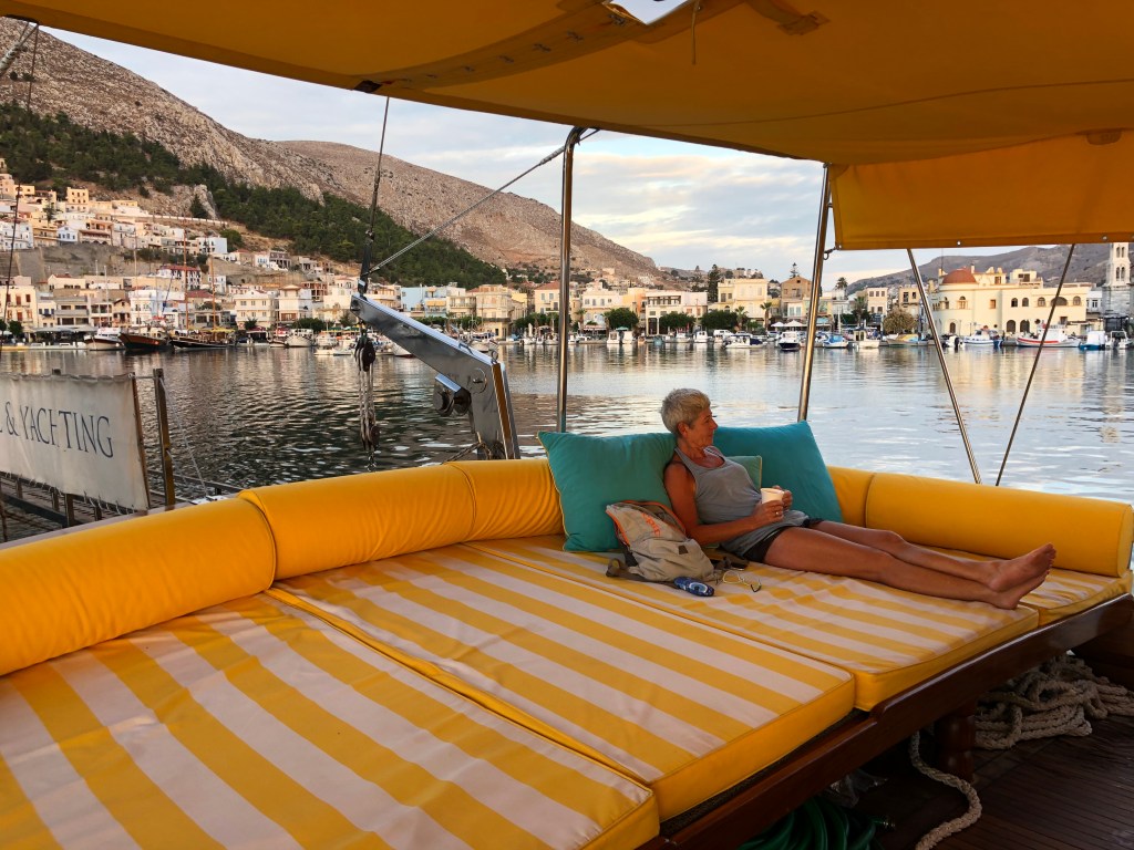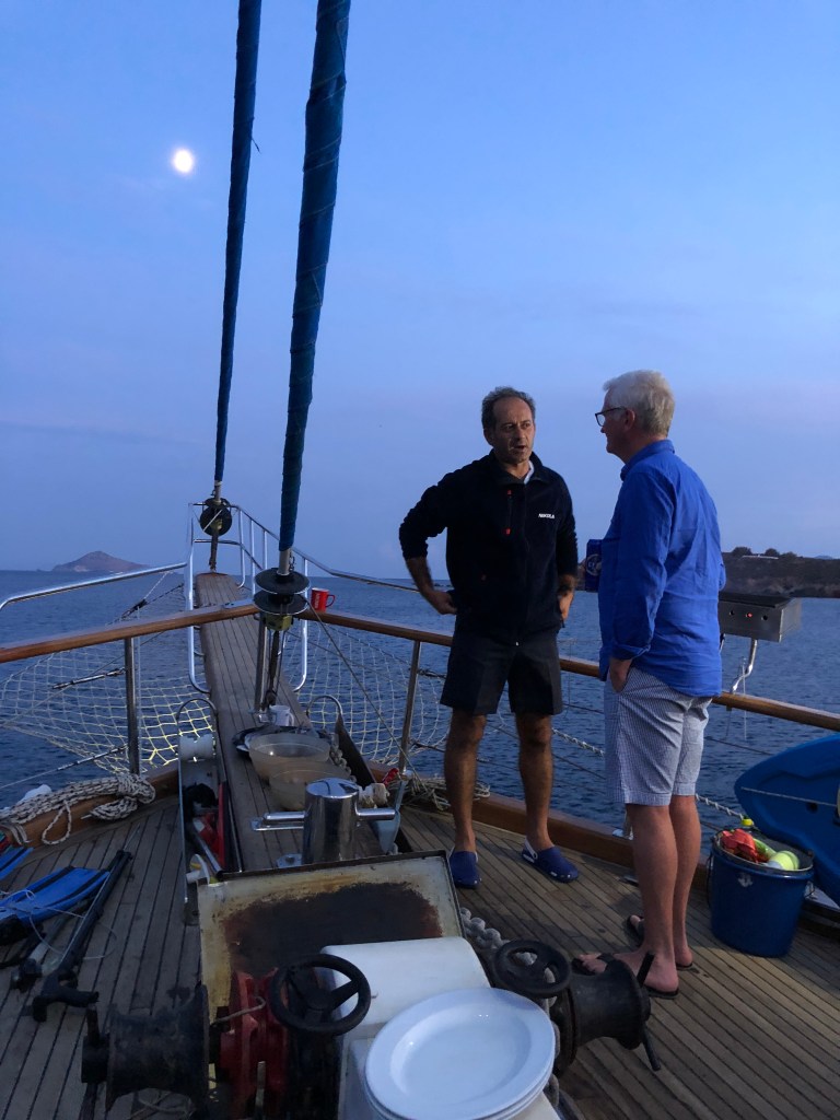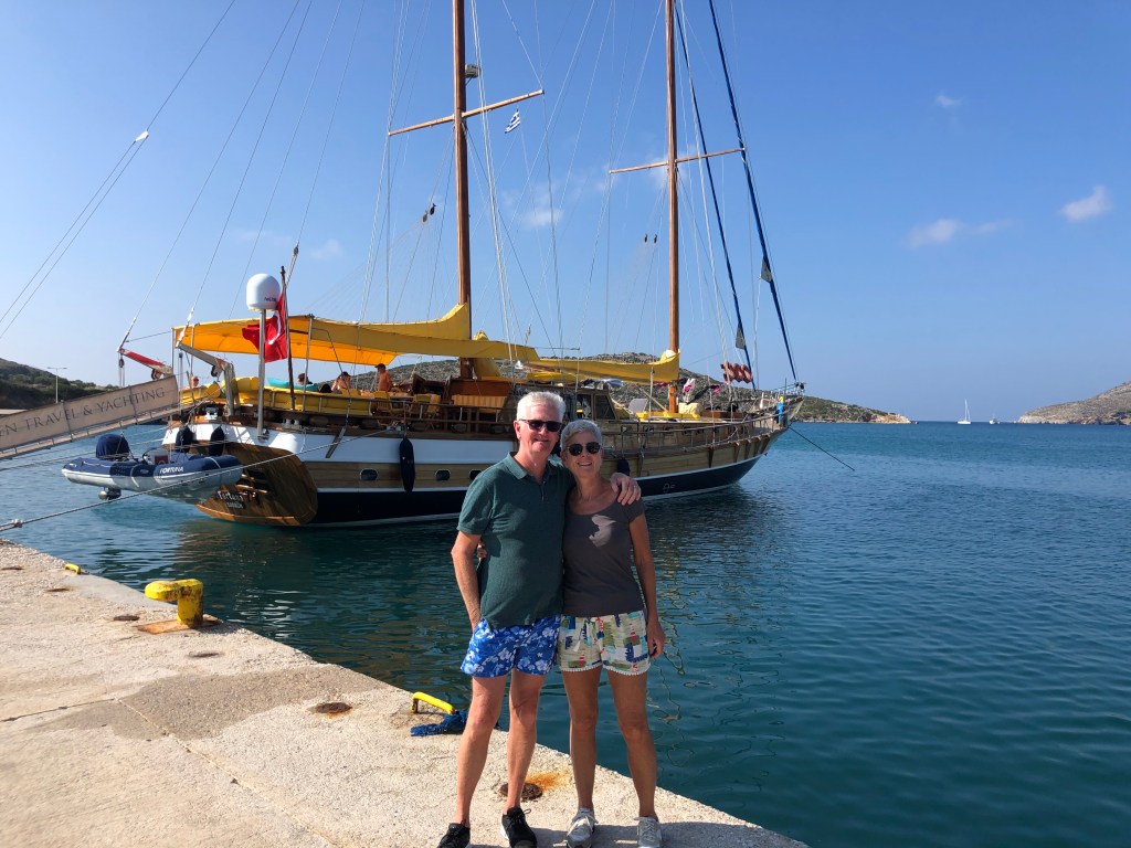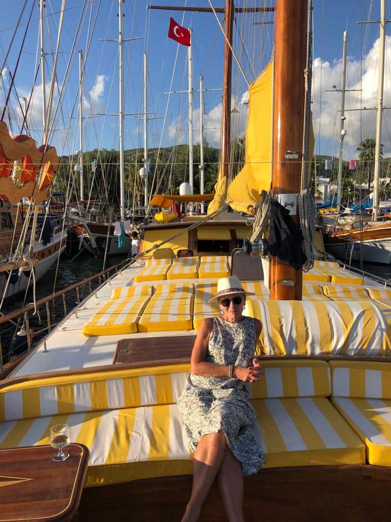 After a couple of weeks on Greek islands we joined a boat charter out of Bodrum which took us to smaller, less accessible islands and also along the coast of Turkey. Boat trips like this can be a lottery (as we discovered on the Geriatric Pearl last year). When sharing every meal and spending a week in a reasonably confined space, travelling companions can make or break it. Well we hit the jackpot! We were lucky enough to spend the week with two fabulous Irish couples who adopted Roger as one of their own. Nothing like a few Paddies to liven things up! A brilliant young couple arrived from London at 10pm on the first night, to find the boat totally dark and silent. It wasn’t ’til next morning they discovered they were being held captive by a boatload of oldies. Too late to abandon ship! Turns out they were great sports and a heap of fun, as were our new German friends Sanya and Jens. Thanks to a few boisterous after dinner parties, we now have some great new friends and an international Spotify playlist featuring everything for German house music to Irish ballads, Swedish beats, INXS and Crowded House.