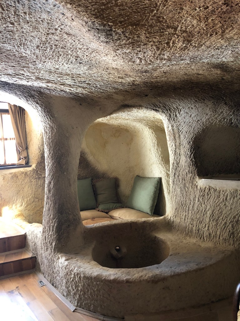 We now have the cave thing well and truly out of our systems. Cappadocia has to be the cave capital of the world. We stayed in a cave hotel. We ate in cave restaurants. The shops and wine bars are in caves. All amazingly sculpted but dimly lit and challenging for the sight-impaired once the novelty wears off! After all these centuries, the limestone is still malting pebbles, so housekeepers really have their work cut out for them.